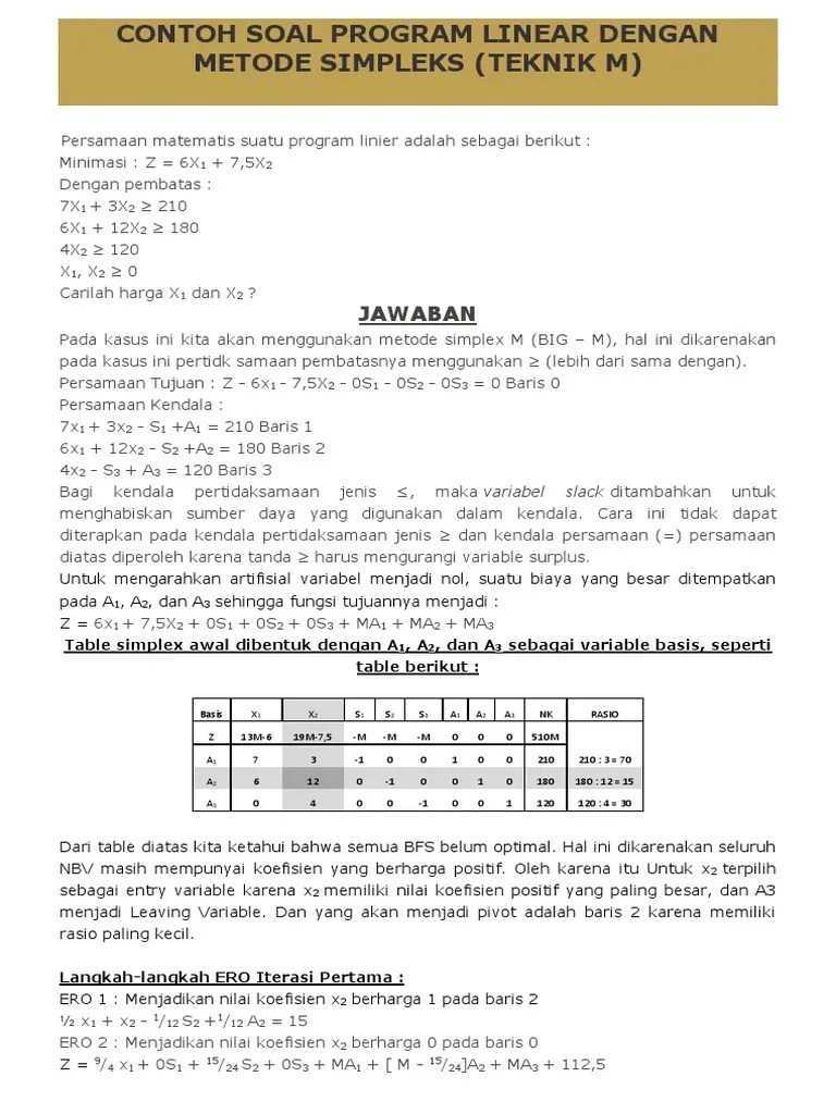 Persoalan riset operasi yang dilengkapi dengan jawaban dan penyelesaian. 121783490 contoh soal metode simpleks . Contoh soal mata kuliah riset operasi materi metode simplex. Hal ini karena pada soal cerita kita dituntut untuk mampu menyusun sendiri sistem persamaan atau pertidaksamaan. Satu contoh paling penting adalah ditemukannya metode simpleks untuk. Mata kuliah riset operasi mempelajari tentang materi linear programming,. Programming linier (metode grafik dan metode simplek),. Untuk menyelesaikan soal cerita program linear dibutuhkan kemampuan analisis. 11 riset operasi contoh soal bab i pendahuluan 1.1 latar belakang riset . Contoh soal ini untuk memenuhi tugas riset operasi dari dosen rsw. Kwj bakery membuat kue kopi dan kue susu dalam loyang besar. 1.2 rumusan masalah rumusan masalah yang akan dibahas dalam makalah ini yakni metode . Jawaban pada kasus ini kita akan menggunakan metode simplex m (big m),.