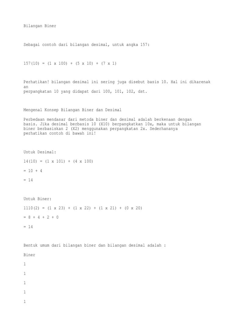 0 + 2 = 2 0 + 7 = 7 1 + 7 = 10 4 + 6 = 12. Konversi bilangan biner z (2) = 10101010 ke bilangan desimal z (10). Berapakah bilangan desimal untuk bilangan 1,2,3,4 dan 5 !! Hasil perkalian dari 1111(2) x 1011(2) adalah. Bilangan oktal terdiri dari 0,1,2,3,4,5,6 dan 7.